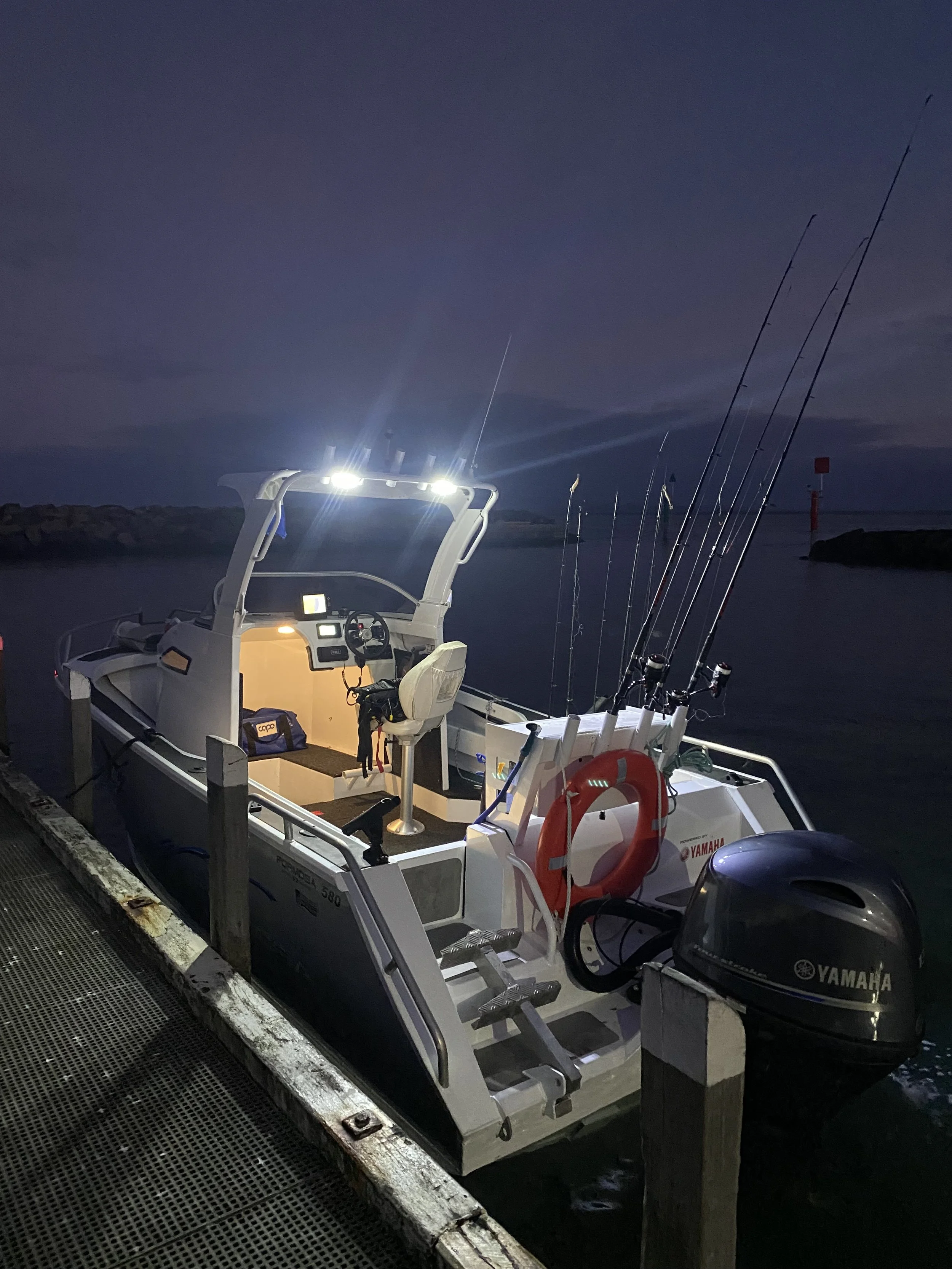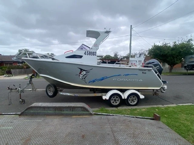Our Formosa 580 is powered by a 130hp Yamaha motor, providing reliability, safety and speed. Our boat is a no pretend fisher; it’s the real deal – with a Tomohawk hardtop, a long cockpit and an almost vertical cabin to maximise the boat space. All safety gear and fuel is included in your boat hire fee. Our hire includes: